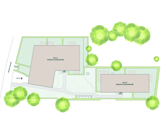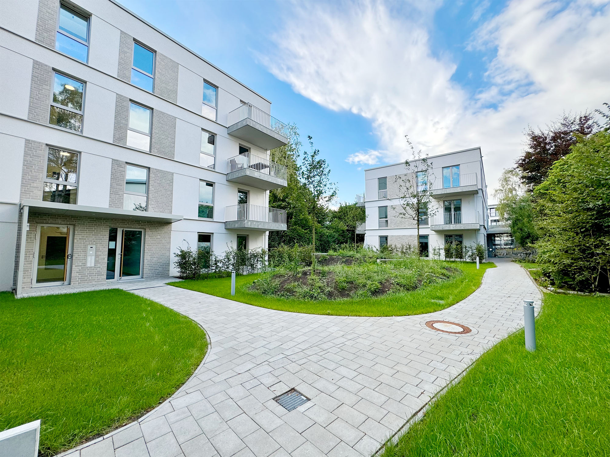 Hier vorn findet sich das Gros der verfügbaren Loggien-Wohnungen sowie die Einfahrt zur Tiefgarage und die Südost-Zuwegung in den mittleren, parkähnlichen Bereich. Dieser führt, angenehm abgeschirmt vom Straßen- und Stadtgeschehen, zu den beiden Hauseingängen. Jetzt offenbart sich auch der "Quartiers"-Charakter der zwei Häuser: Die Sitzmöglichkeiten und die Bepflanzung zwischen den Gebäuden verleihen der Anlage das Gefühl einer privaten Idylle, eines Dorfes inmitten der Stadt.